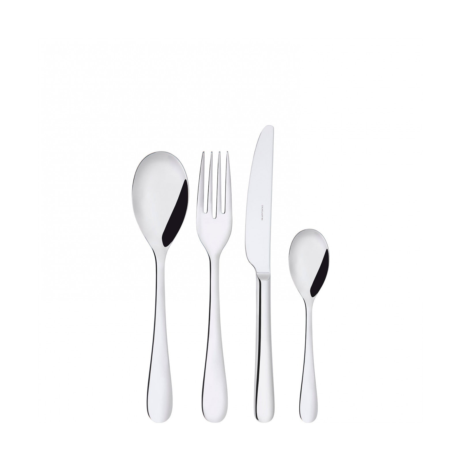 El set de 24 piezas está compuesto por: 6 cucharas de mesa, 6 tenedores de mesa, 6 cuchillos de mesa, 6 cucharas de café.